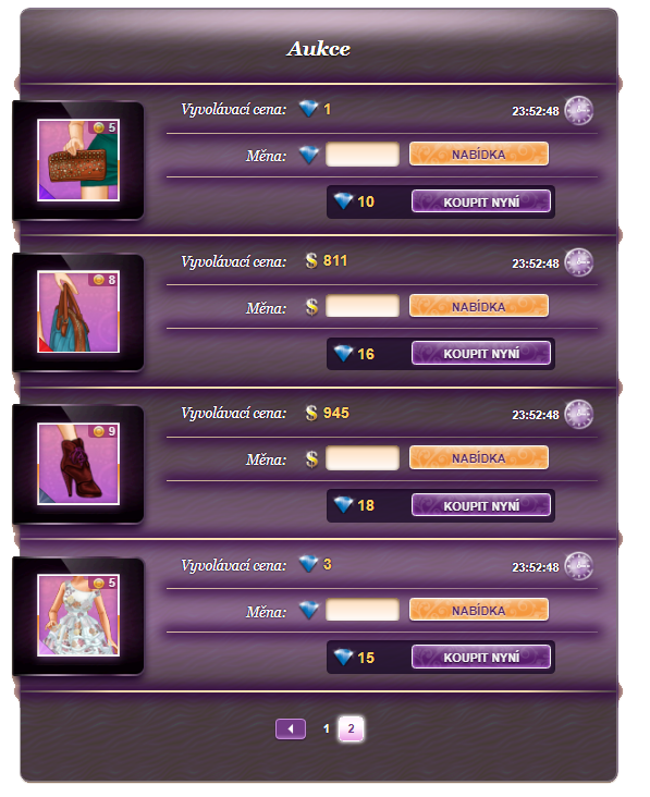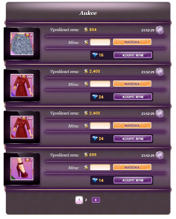 Po dlouhých, dlouhých, hoooodně dlouhých dobách k nám zavítala opět aukce, ... Až na nějaké věci, co, přísahám, jsem viděla už kdysi dávno v zimní kolekci, jsou tam překrásné šatečky, a další šatečky atd.... Oproti našim kolegům ze Slovenska jsme hodně vyhráli, máme toho mnohem více a mnohem hezčí... Takže utíkejte přihazovat své dolárky a diamantíky ať máte nejvyšší nabídkou .... Pro odhad kdo ještě nikdy na aukci nebyl, ... mám z pradávné aukce takové pěkné žluťoučké botičky, přihazovat se mohlo od 500 Dolarů a kupovala jsem je nevyšší nabídkou za 150 000 .... Ale ještě co mi utkvělo v pamněti, aukce byly vždy tak na 12 hodin, .. ale teď jsou na celý den, no tak to potěš koště kdo u toho bude trčet pokud něco chce vyaukcovat a nekoupí si to rovnou .... HODNĚ ŠTĚSTÍ!